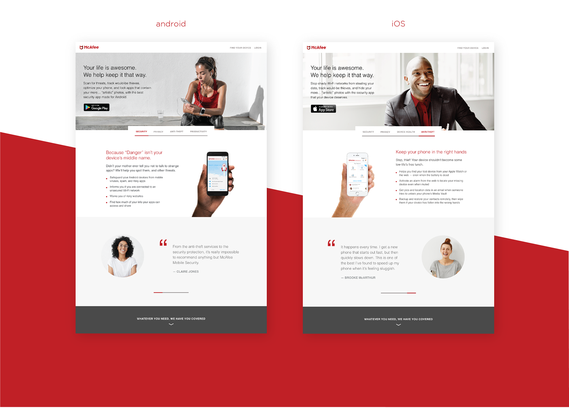 I saw this project through from research, to strategy, to wire-framing, to design. McAfee's Mobile Security app offers different features to Android and iOS users, so our challenge was to create an experience that was able to cater to both.